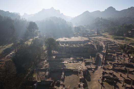 Site archéologique de Glanum, vue aérienne de la maison des Antes et du marché hellénistique