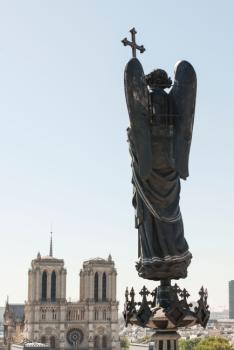 Sainte-Chapelle de Paris, statue de l'archange saint Michel, de dos, et tours de la cathédrale Notre-Dame
