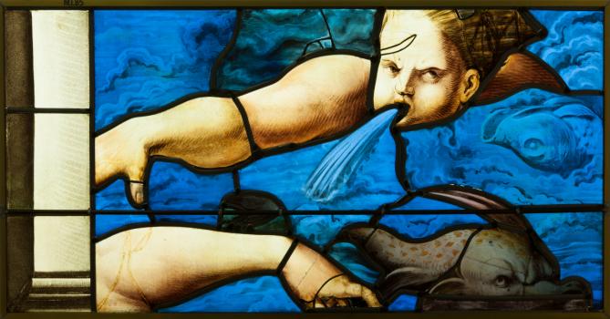 Sainte-Chapelle de Paris, poinçon à décor anthropomorphe, socle de la statue de l'archange sur le toit du chevet