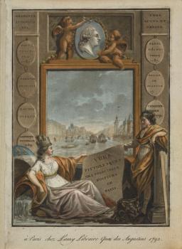 La Ville de Paris et l'Architecture présentant les "Vues pittoresques", avec en arrière plan un tableau montrant un pont de Paris