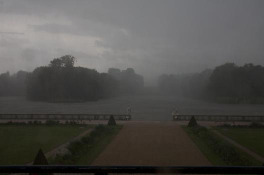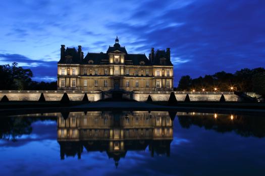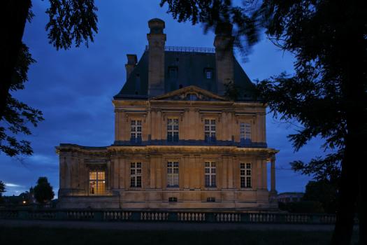 Château de Maisons, ensemble sud ouest, illumination de la façade sur jardin vue depuis la terrasse