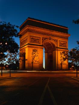 L'Arc de triomphe de l'Étoile au crépuscule, côté sud-est, depuis l'avenue Marceau