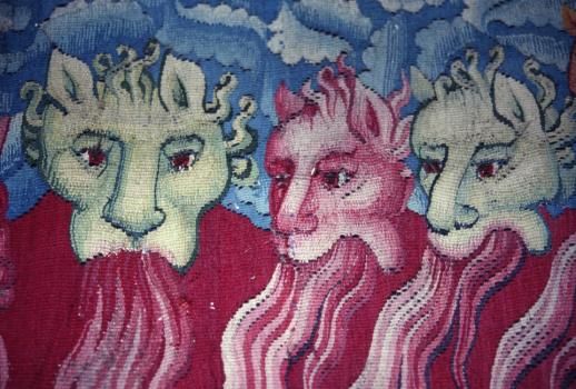 L'ange au livre, détail de trois des têtes crachant du feu