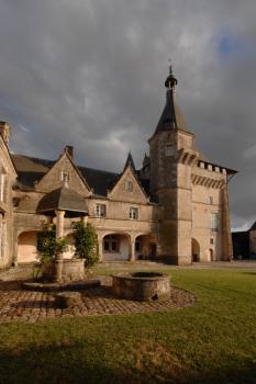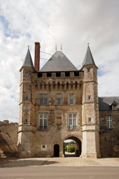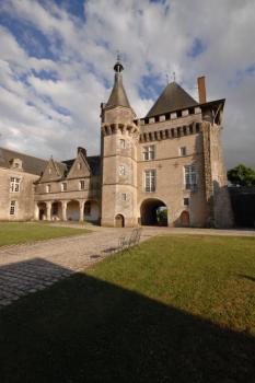 Château de Fougères-sur-Bièvre, vue panoramique de la cour d'honneur, la tour d'escalier, le revers de la façade d'entrée et la galerie orientale