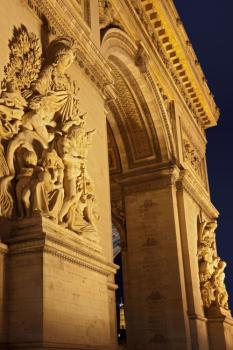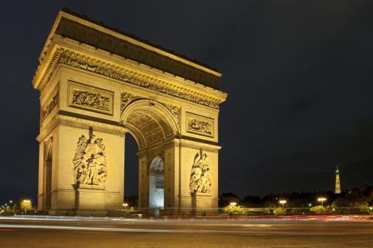Arc de triomphe de l'Étoile, de nuit, hauts-reliefs de la façade ouest et tour Eiffel se détachant entre les piédroits