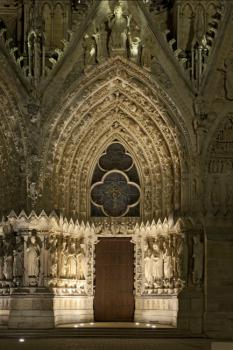Cathédrale Notre-Dame de Reims, façade occidentale, portail sud vu de nuit
