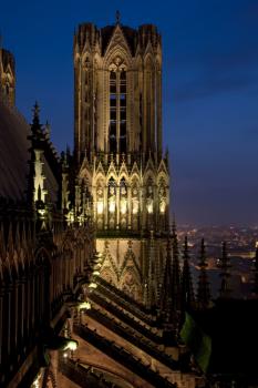 Cathédrale Notre-Dame de Reims, parties hautes du flanc nord de la nef, vers l'ouest, vues de nuit