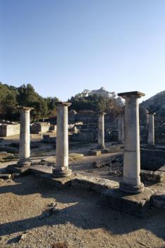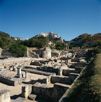 Site archéologique de Glanum, vue en direction de la maison de Cybèle et d'Atys et du petit temple géminé