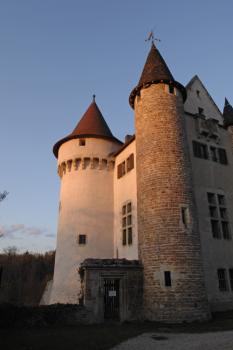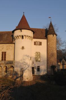 Château d'Aulteribe, façade ouest, entre les deux tours sud, au coucher du soleil
