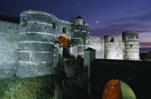Château d'Angers, porte de la Ville et son pont-levis au crépuscule