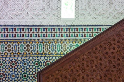 Mosquée Sahaba, salle de prière : détail des mosaïques et du minbar