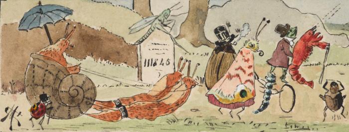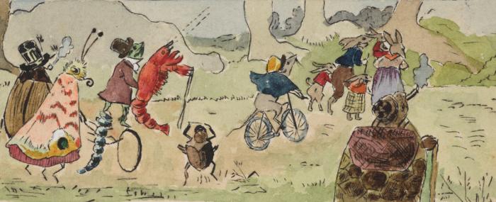 Carton d'invitation ou de placement illustré d'un cortège d'animaux endimanchés se rendant à une soirée (détail)