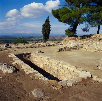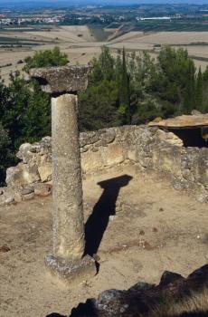 Oppidum d'Ensérune, quartier du flanc nord, maison à la colonne et panorama sur l'étang asséché de Montady