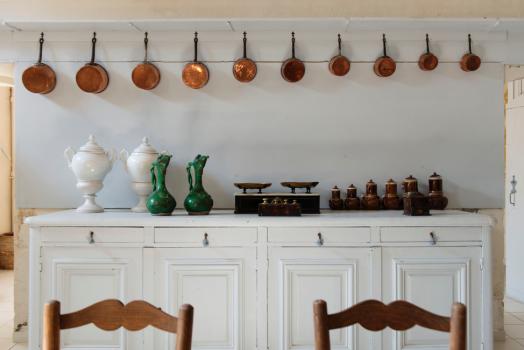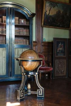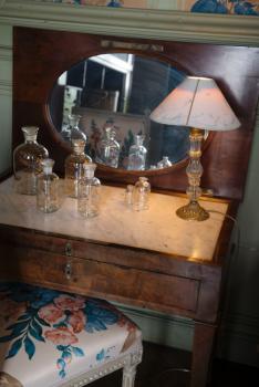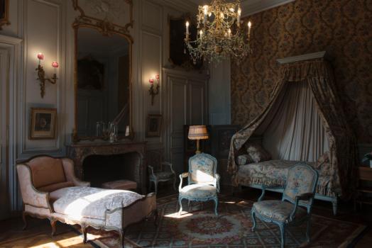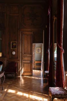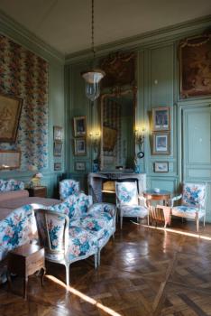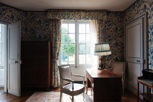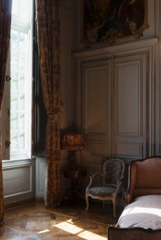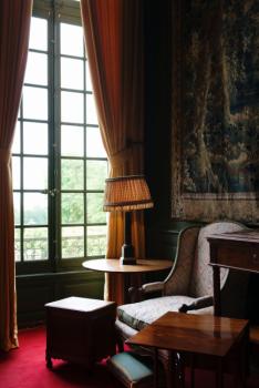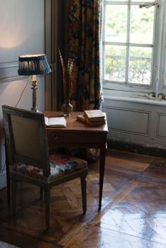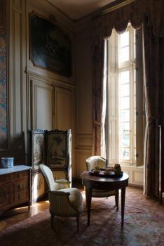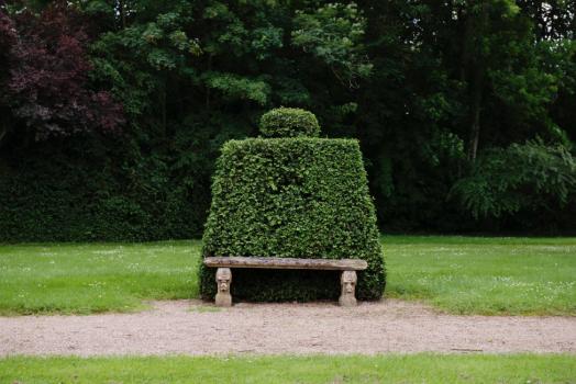 Château de Bouges, banc de pierre et buis taillé du parterre ouest