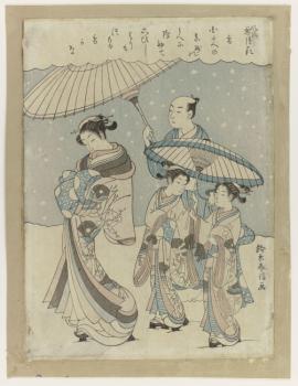 Femme, homme et deux jeunes filles s'abritant sous des ombrelles