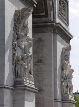 Arc de triomphe de l'Étoile, deux hauts-reliefs de la façade ouest, La Paix et La Résistance, vus du nord-ouest
