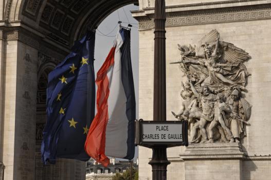 Drapeaux français et européen flottant sous l'Arc de triomphe de l'Étoile