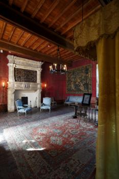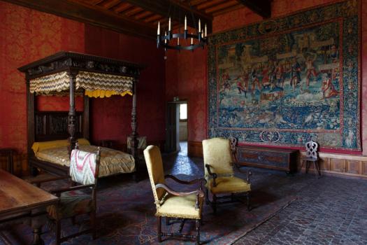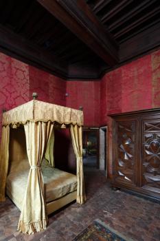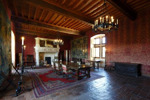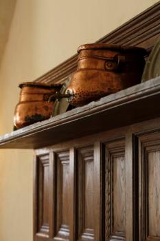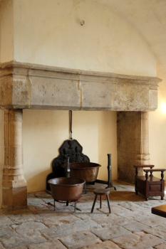 Château de Montal, cuisine, chaudrons sur l'étagère murale