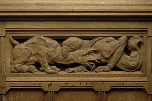 Château de Pierrefonds, détail des lambris, combat d'animaux fantastiques