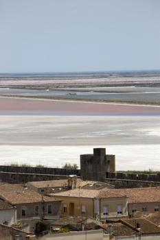 Tours et remparts d'Aigues-Mortes, front sud vu des marais salants