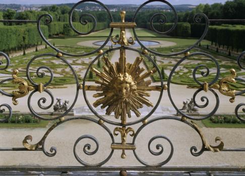 Château de Champs-sur-Marne, garde-corps du balcon du salon de musique et perspective sur le jardin