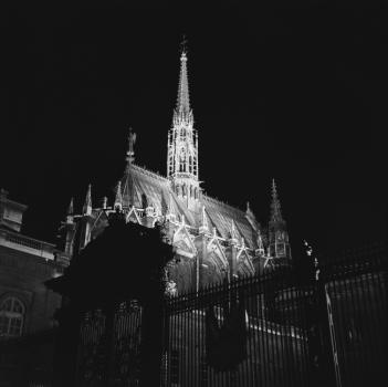 Cathédrale Notre-Dame de Reims, parties hautes du flanc nord de la nef, vers l'ouest, vues de nuit