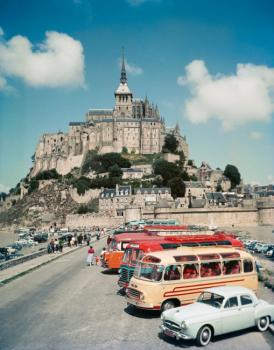 Mont-Saint-Michel et véhicules stationnant aux abords et sur la digue-route