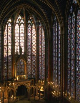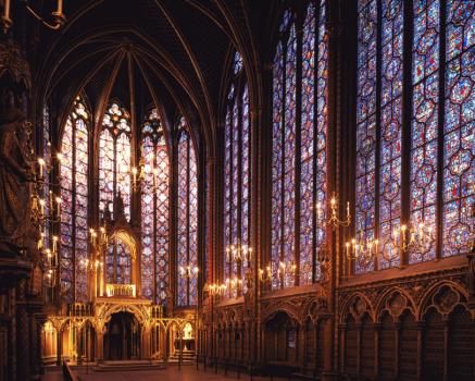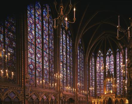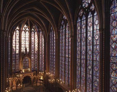 Sainte-Chapelle de Paris, chapelle haute, tribune des reliques, verrières de l'abside et de deux baies sud de la nef